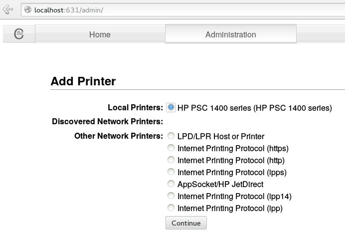 Una vez en la interfaz web, pinchamos en “Administración” y después en “Add printer”. Nos pedirá nuestras credenciales, e introduciremos las del usuario al que agregamos al grupo lpadmin: