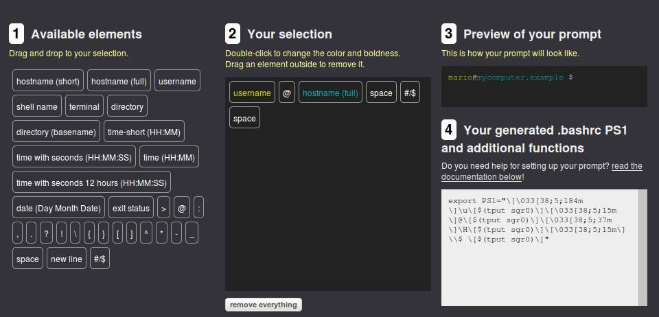 Toda esta información se guarda en la variable de entorno PS1. Si bien siempre podemos generar nuestro prompt de forma manual con un poco de paciencia y documentación, recientemente descubrí bashrcgenerator, un generador web de prompts en modo drag & drop que nos facilita bastante la vida.